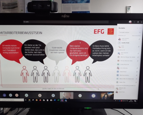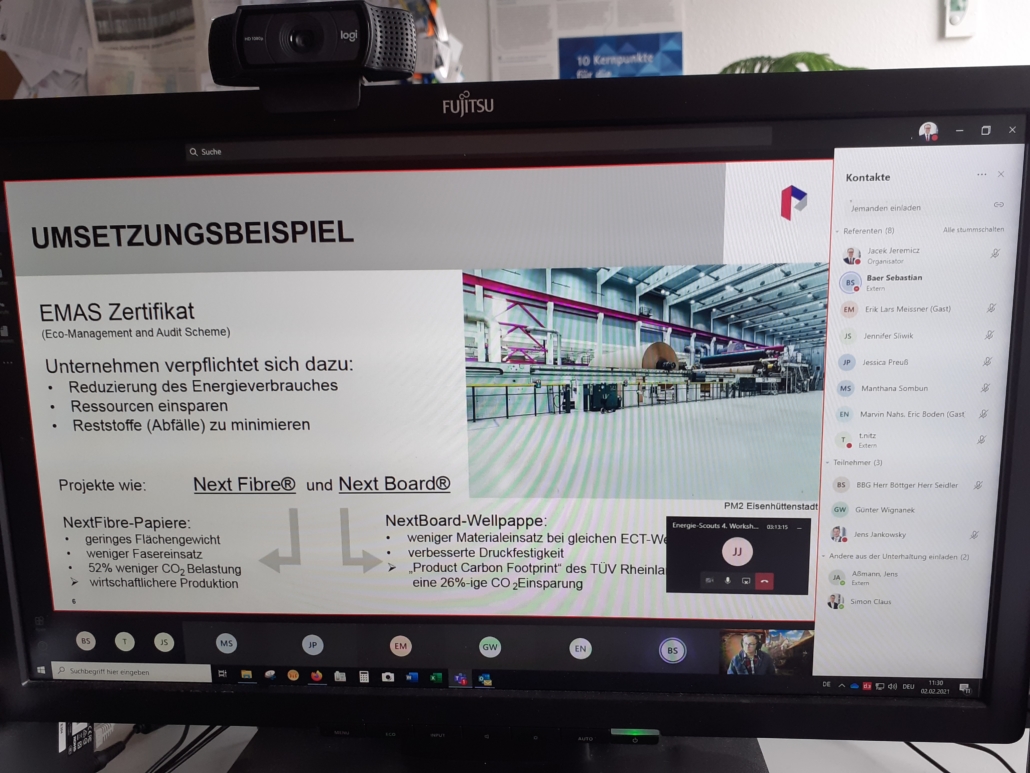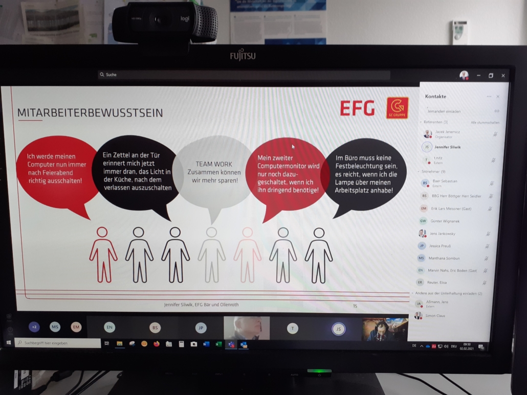 Zum ersten Mal fand am 02.02.2021 der Online-Abschlussworkshop des Kurses „Energie-Scouts“ online statt, welcher Ende Oktober 2020 als Präsenzveranstaltung begann. Nach einer lebhaften Diskussion wählte die Jury zwei Gewinnerprojekte aus, die für den diesjährigen Bundeswettbewerb angemeldet werden. Die beiden Energieeffizienzideen, die die Jury am meisten überzeugten, wurden von den Azubis der EFG Bär & Ollenroth KG und der Tinglev Elementenfabrik GmbH entwickelt.