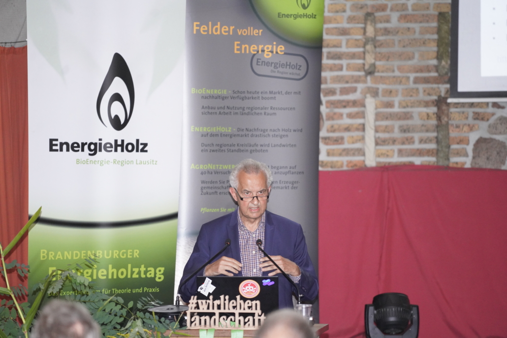 Im Anschluss stellte Prof. Dr. Reinhard Hüttl (Eco-Environment Innovation) die aktuelle Bundeswald-Inventur vor und regte das Publikum an, den Fokus von Holz als Energielieferant auf Holz als Kohlenstoffspeicher zu verlagern – nicht nur über, sondern auch unter der Erde.