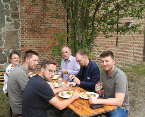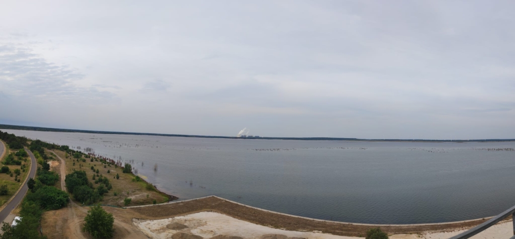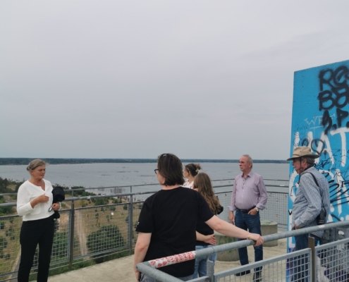 In der abschließenden Exkursion zum Ostsee inklusive Besuch des Merzdorfer Turms erläuterte uns Doris Wüstenhagen (LEAG AG) die bisherige Entwicklungen und einzuhaltenden Regelungen bei der landschaftlichen Gestaltung des ehemaligen Abbaugebietes und die weiteren Pläne in der Region. Mit Blick vom Turm auf die Landschaft und auf eine schwimmende PV-Anlage wurde auch die Nutzung der Region zur Energiegewinnung und der Einfluss von schwimmenden PV-Anlagen auf die Wasserkulturen diskutiert.