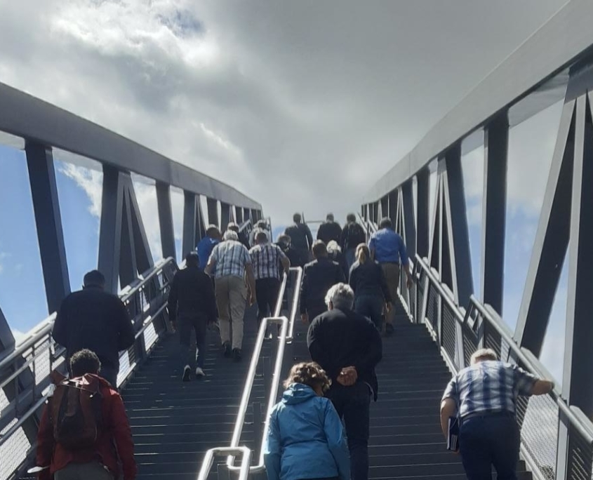 Die Aussichtsplattform „Steinitzer Treppe“ befindet sich auf der höchsten Erhebung der „Steinitzer Alpen“. Die Konstruktion aus 117 Tonnen Stahl erinnert an den Ausleger einer Förderbrücke im Braunkohletagebau. Von ihr aus erhält man einen Blick in den Randbereich des Tagebaus Welzow, in welchem seit 1966 Braunkohle gefördert wird. Von dieser Plattform erklärte uns ein Mitarbeiter des „Forschungsinstitut für Bergbaufolgelandschaften e.V.“ den aktuellen Stand des Umbaus.